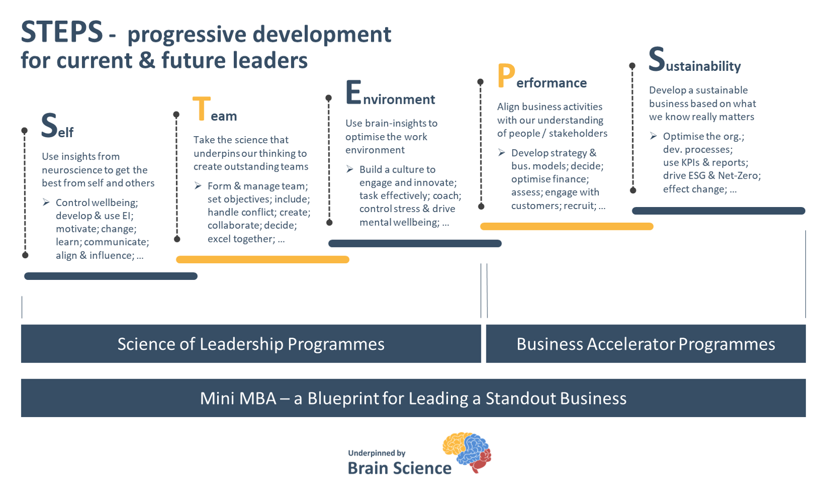 Our proprietary STEPS Model provides a clear, actionable roadmap for transforming leaders, teams, and organisations - integrating brain science with real-world business challenges.