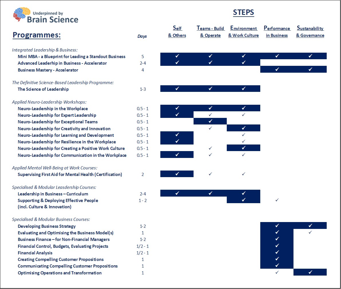 In the additional STEPS, we build on the first three to develop competencies in the professional and technical areas of running a business - profitably, sustainably, and positively. We tackle performance within key organisational / business disciplines in STEP 4 - and in STEP 5 we build the organisational competencies needed to make any business / organisation sustainable - increasing its long-term viability, and giving it a solid foundation rooted in good governance. Each step draws on compelling insights from the science - reflected in the training programmes!